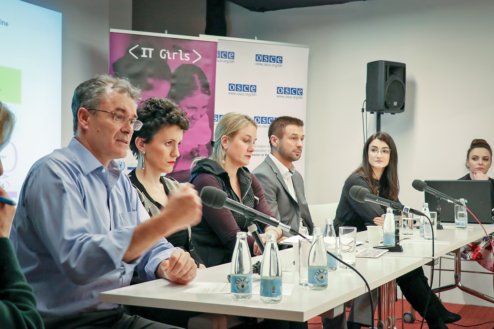Panelists at a panel-discussion on gender-based violence against women and girls in cyberspace, jointly organised by the OSCE Mission to Bosnia and Herzegovina and 'IT Girls' - the United Nations and Embassy of Sweden to Bosnia and Herzegovina supported project; Sarajevo, 9 December 2019
