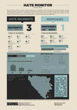 Hate-motivated incidents are often violent manifestations of intolerance which instil fear and divide communities. Tackling underlying prejudice is essential in combating the spread of these divisive actions. The OSCE Mission to Bosnia and Herzegovina supports the work of government institutions, the criminal justice system, local authorities and civil society to effectively respond to these incidents. The 'Hate Monitor' provides a monthly update on incidents and responses throughout Bosnia and Herzegovina.