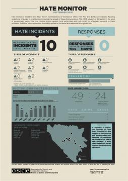 Hate-motivated incidents are often violent manifestations of intolerance which instil fear and divide communities. Tackling underlying prejudice is essential in combating the spread of these divisive actions. The OSCE Mission to Bosnia and Herzegovina supports the work of government institutions, the criminal justice system, local authorities and civil society to effectively respond to these incidents. The 'Hate Monitor' provides a monthly update on incidents and responses throughout Bosnia and Herzegovina.