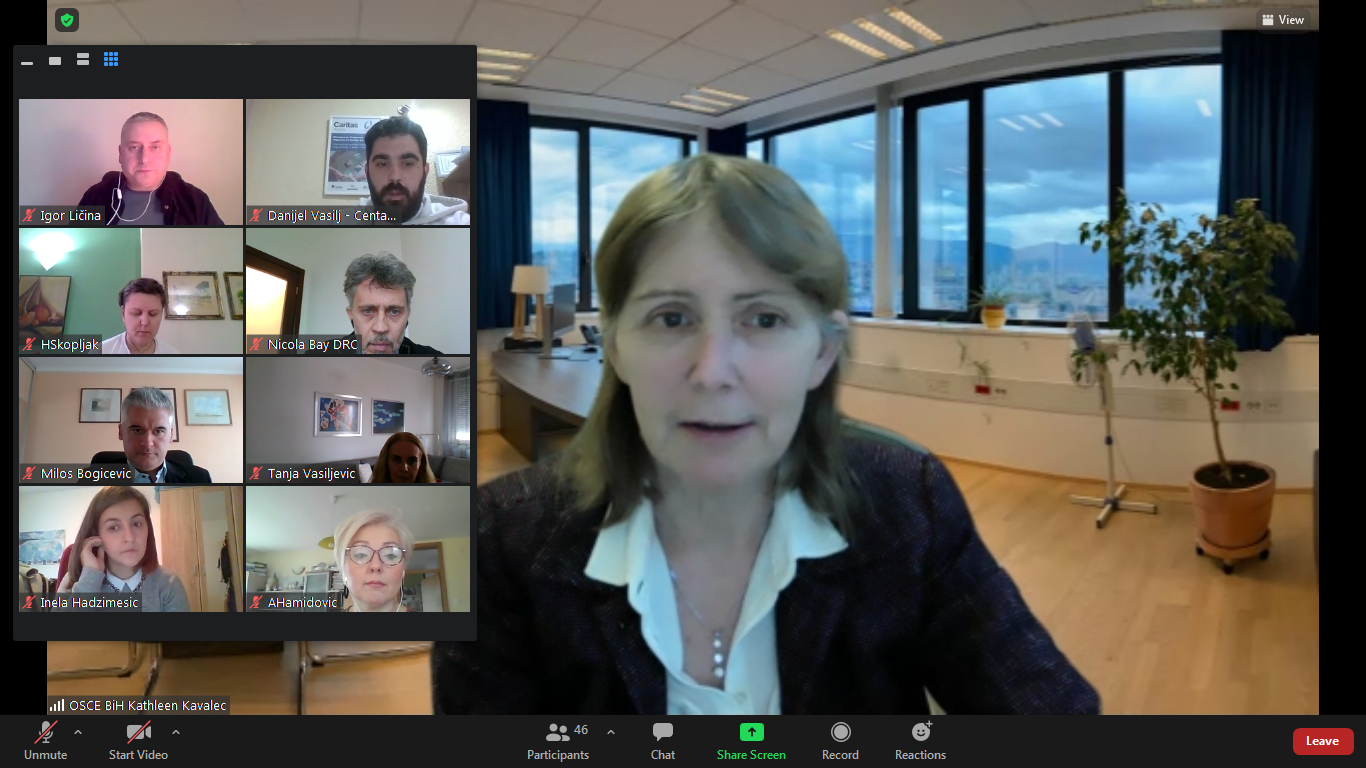 Kathleen Kavalec, Head of the OSCE Mission to Bosnia and Herzegovina met with representatives of "Amnesty International", Danish Refugee Council", "Are You Syrious", "Save the Children", "No Name Kitchen" and "Puz" NGOs to hear first-hand accounts of border violence and challenges faced by aid organisations responding to the mixed migration crisis in Bosnia and Herzegovina; Sarajevo, 25 January 2021