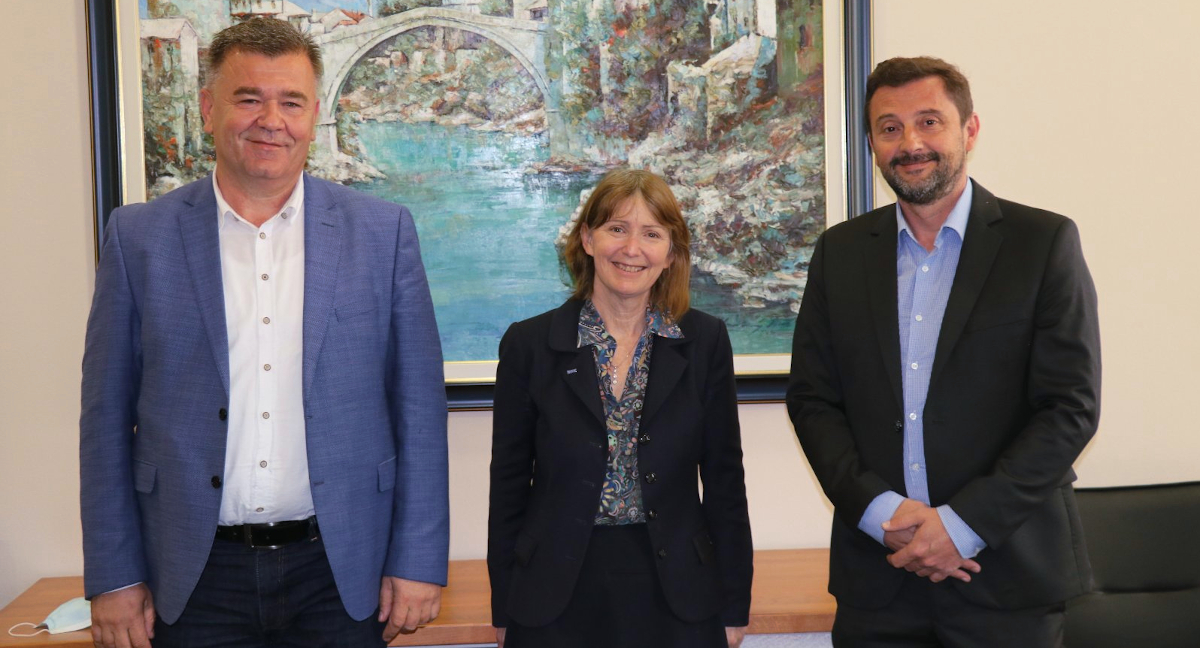 Ambassador Kathleen Kavalec, Head of the OSCE Mission to Bosnia and Herzegovina at a meeting with newly elected Mostar Mayor Mario Kordić (r) and Speaker of Mostar City Council Salem Marić (l); Mostar, 27 April 2021