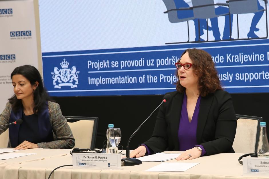 Mina Noor, Deputy Head Of Mission - Embassy of the Kingdom of the Netherlands in Bosnia and Herzegovina (l) and Head of the OSCE Mission to Bosnia and Herzegovina' Security Co-operation Department, Dr Susan Penksa (r) at the OSCE-organized "Table Top Exercises on Prevention and Countering of Violent Extremism and Radicalization Leading to Terrorism"; Sarajevo 9-10 March, 2022