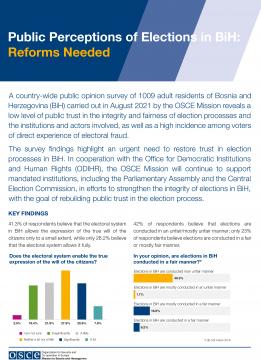 A country-wide public opinion survey of 1009 adult residents of Bosnia and Herzegovina (BiH) carried out in August 2021 by the OSCE Mission reveals a low level of public trust in the integrity and fairness of election processes and the institutions and actors involved, as well as a high incidence among voters of direct experience of electoral fraud.
