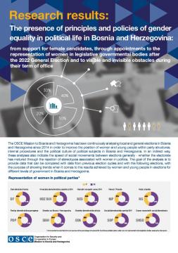 Research results: The presence of principles and policies of gender equality in political life in Bosnia and Herzegovina, from support for female candidates, through appointments to the representation of women in legislative governmental bodies after the 2022 General Election and to visible and invisible obstacles during their term of office.