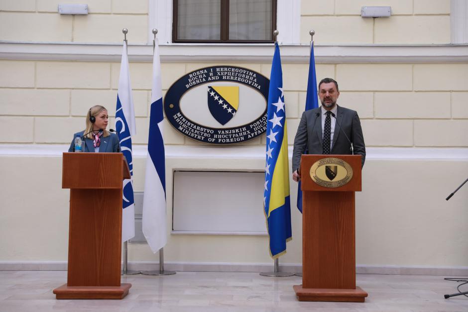 OSCE Chairperson-in-Office Elina Valtonen at a press conference with BiH Minister of Foreign Affairs Elmedin Konaković.