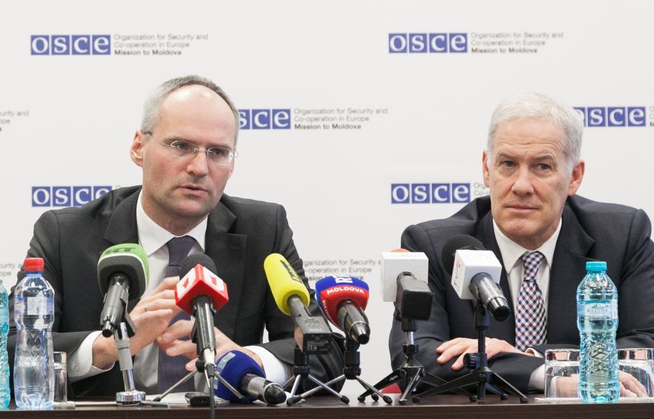 (L-r) Ambassador Wolf-Dietrich Heim, Special Representative of the OSCE Chairperson-in-Office for the Transdniestrian settlement process, and Ambassador Michael Scanlan, Head of the OSCE Mission to Moldova, speaking at a press conference, Chisinau, 24 March 2017.