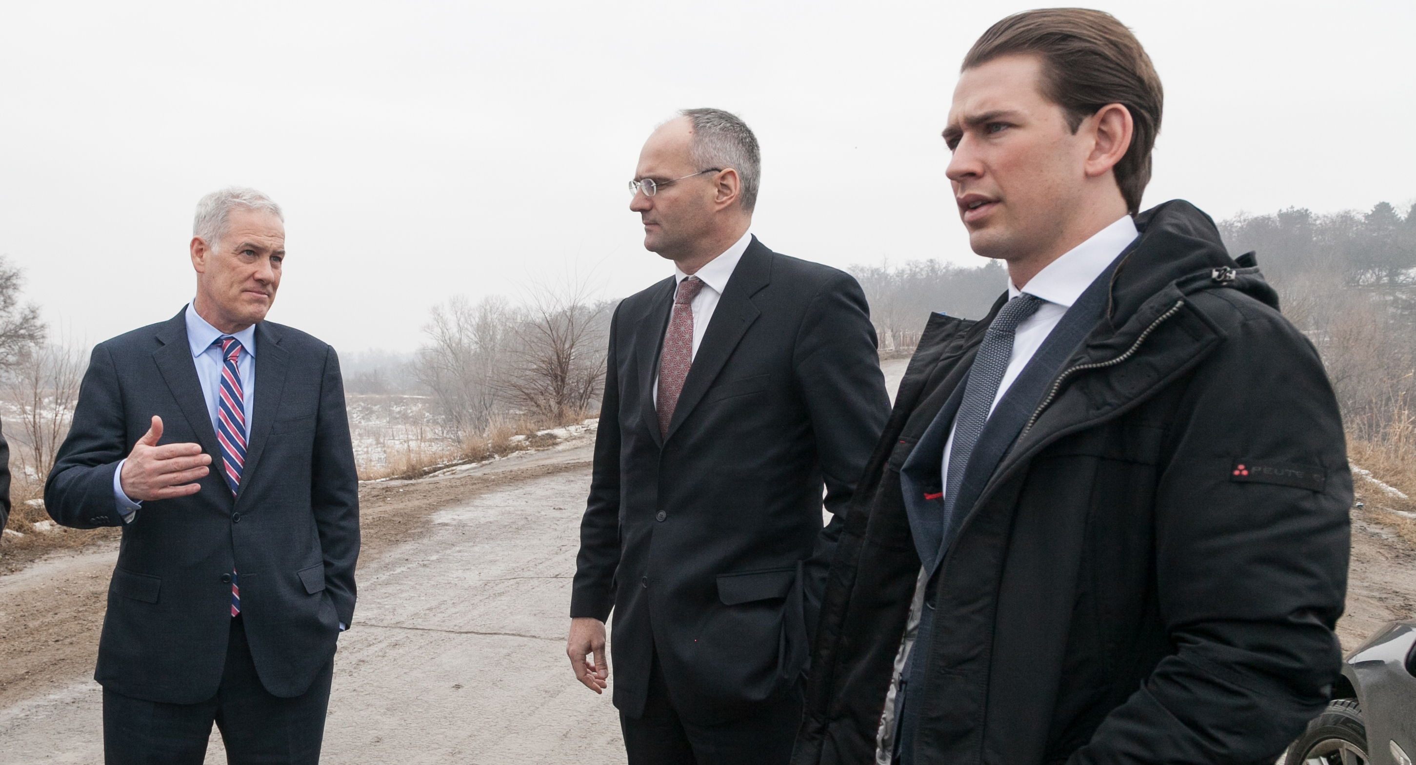 Special Representative of the OSCE Chairperson-in-Office for the Transdniestrian Settlement Process Ambassador Wolf-Dietrich Heim (c), OSCE Chairperson-in-Office and Austrian Foreign Minister Sebastian Kurz (r) and Head of the OSCE Mission to Moldova Ambassador Michael Scanlan (l), on the road to Tiraspol, 4 February 2017.