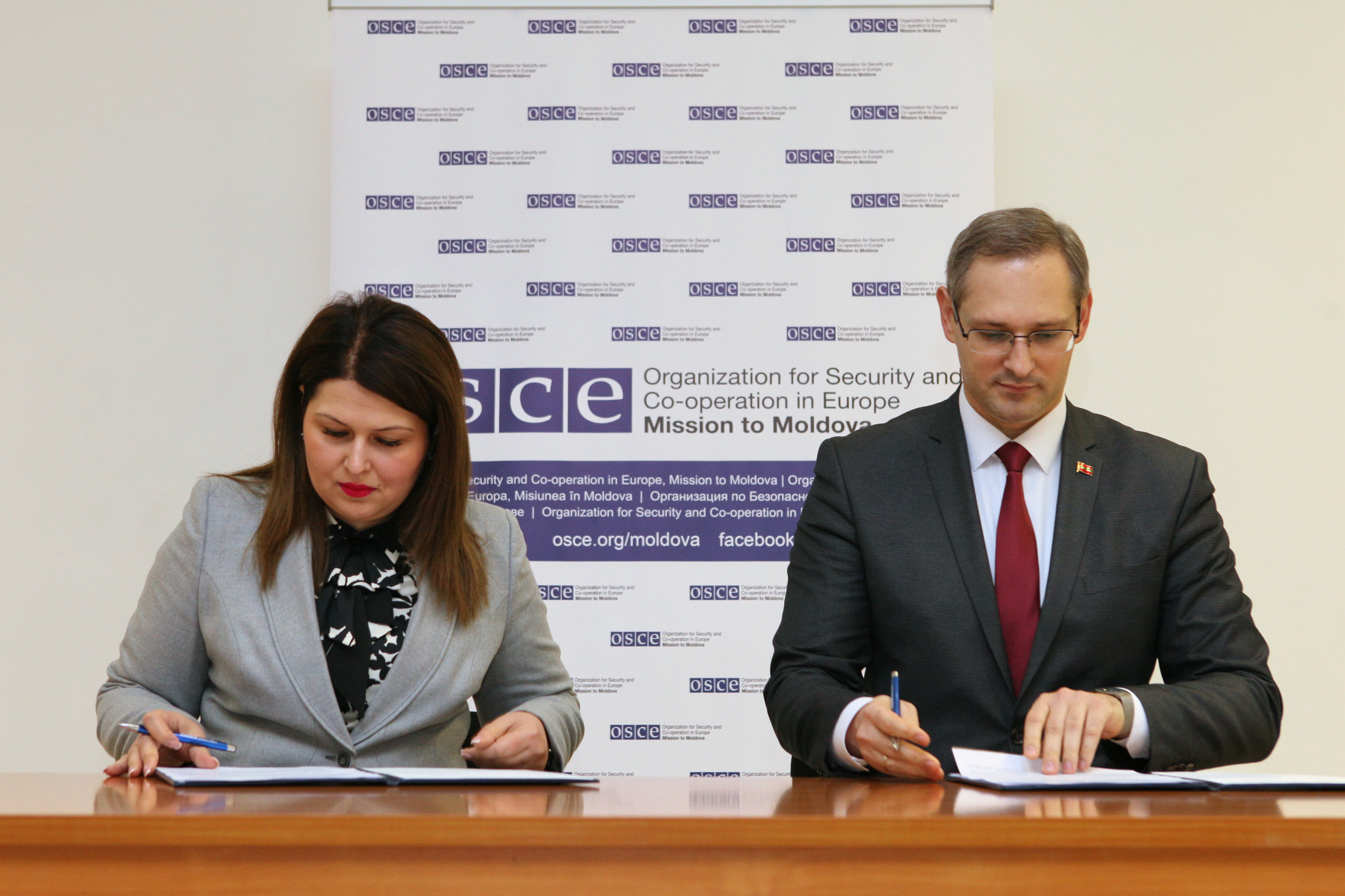 The Moldovan and Transdniestrian Chief Negotiators, Cristina Lesnic (l) and Vitaly Ignatiev (r), sign a Protocol Decision on veterinary, quarantine and plant protection measures, at the OSCE Mission to Moldova, Chisinau, 15 February 2018.