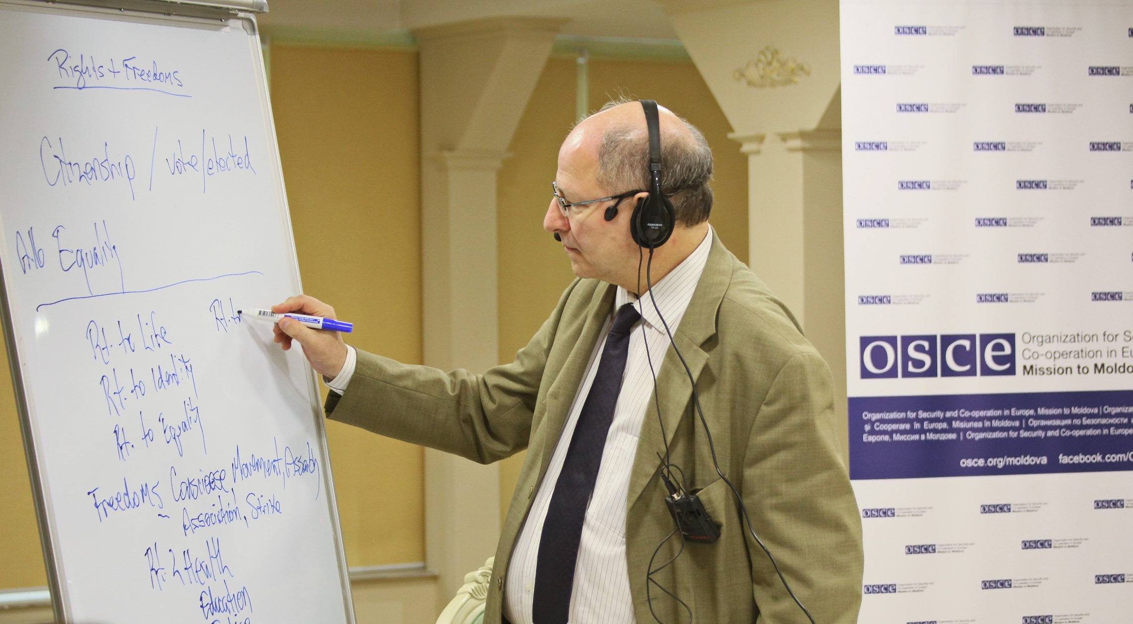 Professor Frederick John Packer from the University of Ottawa explains ways to realize effective participation of national minorities at an OSCE workshop, Chisinau, 15 May 2019.