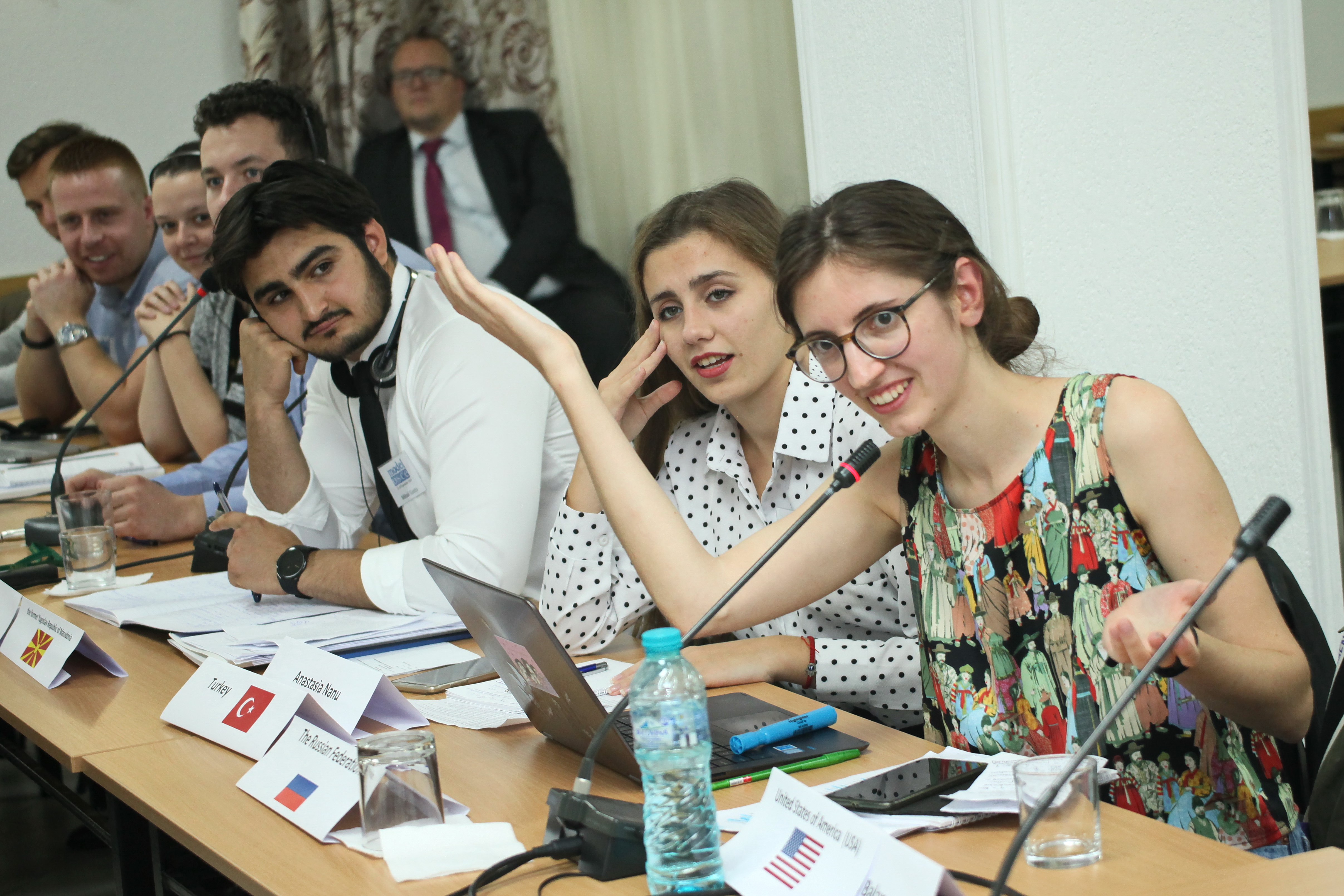 A participant of the Model OSCE for Youth making her voice heard during a simulation of the OSCE Permanent Council meeting, Vadul-lui-Voda, Moldova, 29 September 2019.