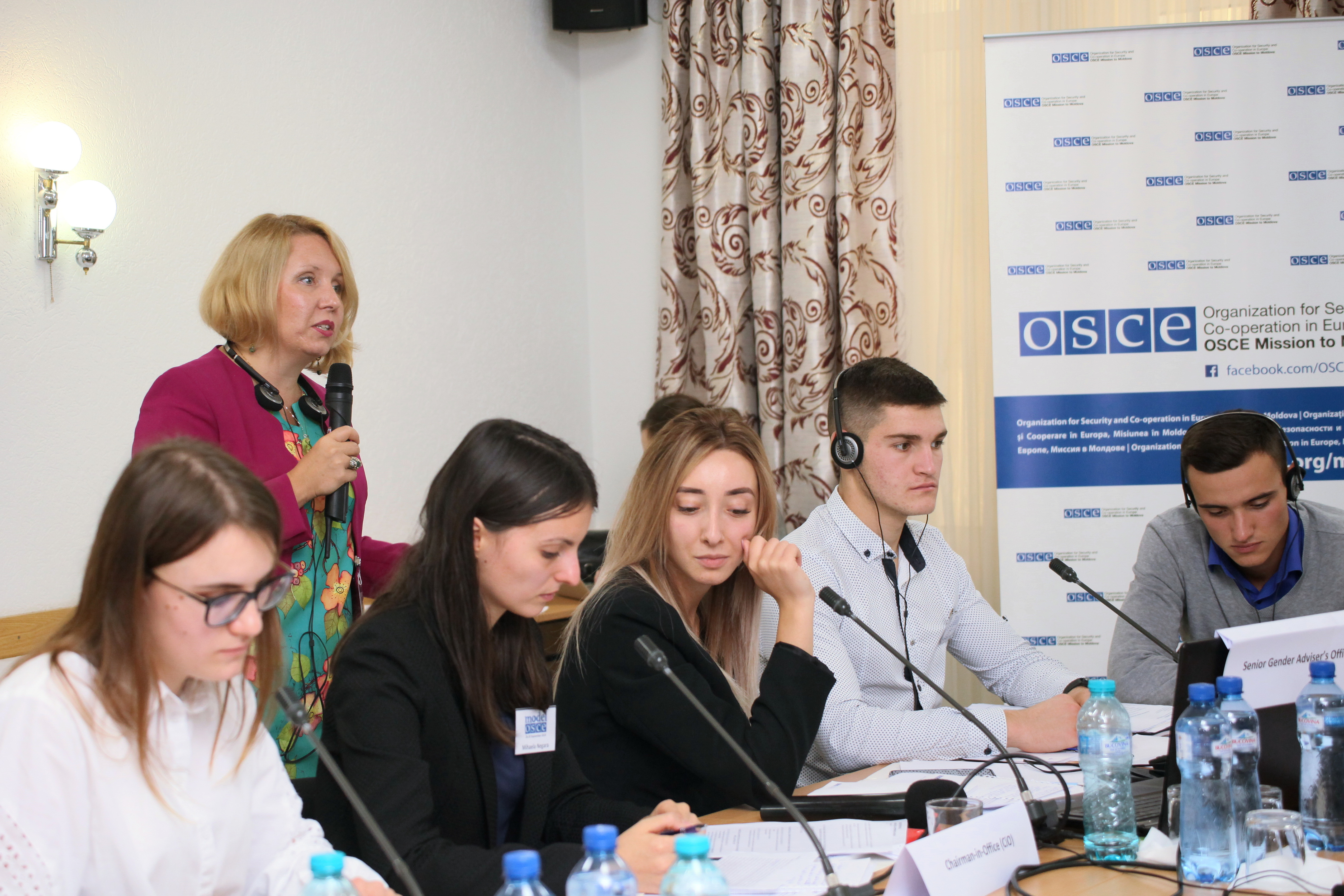 Ida Manton explains to participants of the Model OSCE for Youth about final simulation – finalizing the Addendum to the Gender Action Plan (GAP), Vadul-lui-Voda, Moldova, 29 September 2019.