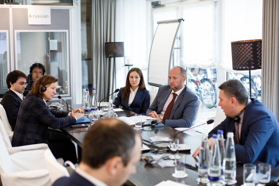 German Ambassador to Moldova Angela Ganninger (l) listens attentively through headphones during a session of the Working Group on education.