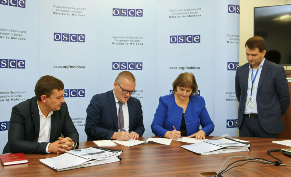 Deputy Head of the OSCE Mission to Moldova, Antti Karttunen, and Svetlana Dogotaru, State Secretary of the Ministry of Economy and Infrastructure signing an acceptance and delivery certificate for the Gura Bicului-Bychok Bridge technical assessment report, Chisinau, 13 November 2019.