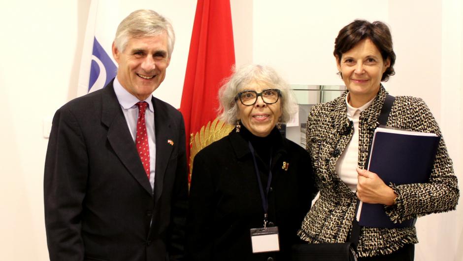 Michael Linhart (l), Austria’s Deputy Foreign Minister, Ambassador Maryse Daviet, Head of OSCE Mission to Montenegro and Anna Janković, Austrian Ambassador to Montenegro, visiting Mission’s premises, Podgorica, 14 November 2017.