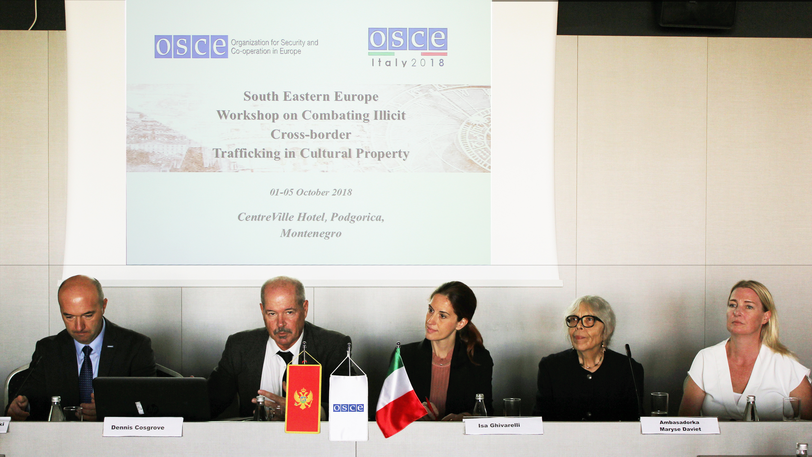 (L-R) Dennis Cosgrove, Head of Border Security and Management Unit / Transnational Threats Department / OSCE, Isa Ghivarelli, Representative of Italian OSCE Chairmanship and - Ambassador Maryse Daviet, Head of OSCE Mission to Montenegro closing the five-day South Eastern Europe Workshop on Combating Illicit Cross-border Trafficking in Cultural Property in Podgorica, 5 October.