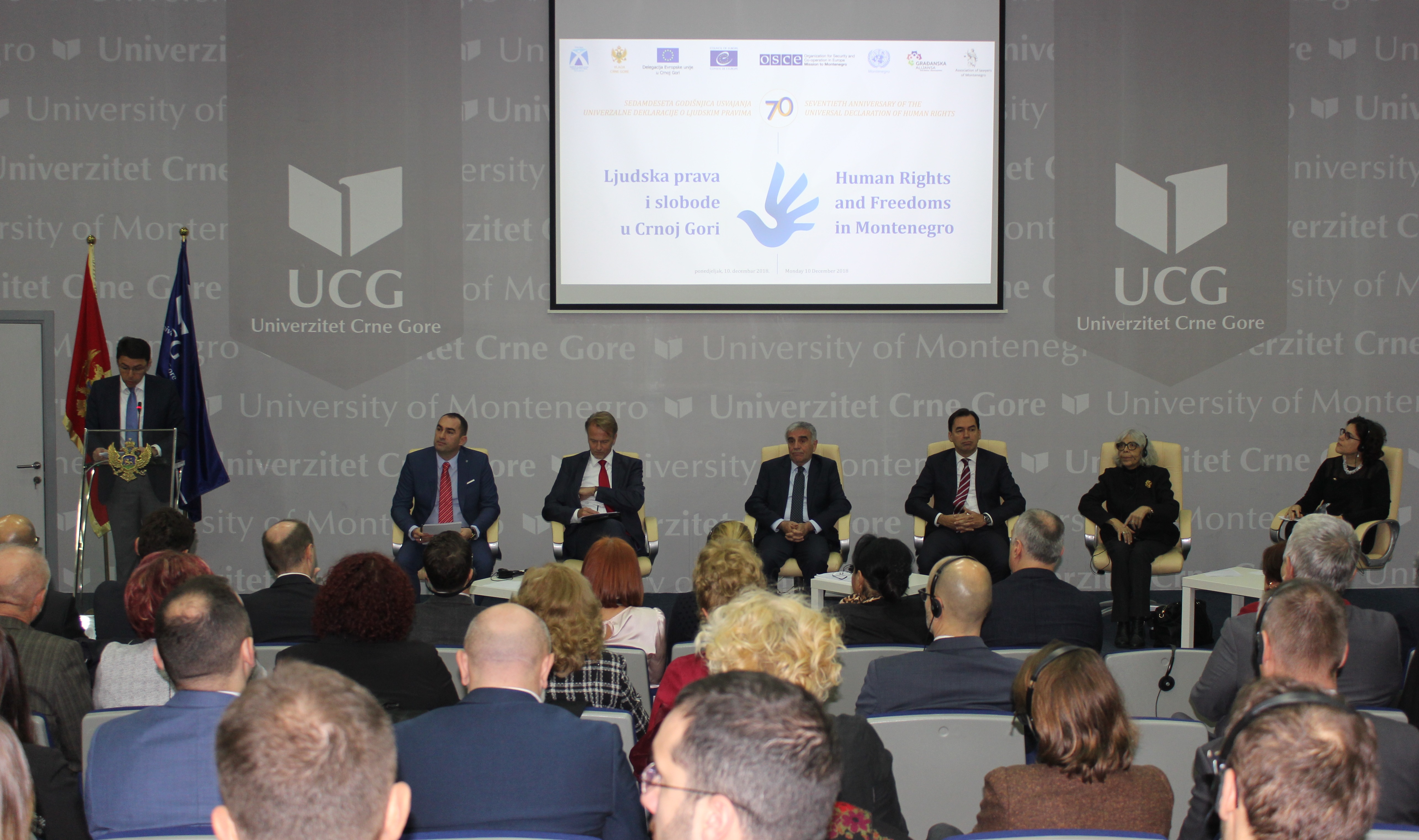 President of the Association of Lawyers Branislav Radulović opening the Conference on Human Rights and Freedoms in Montenegro, adressed also by: (l-r) Milan Radović from NGO Civic Alliance, ambassador Aivo Orav, Head of EU Delegation to Montenegro, Šućko Baković, Protector of Human Rights and Freedoms, Zoran Pažin, Deputy Prime Minister and Minister of Justice in the Government of Montenegro, ambassador Maryse Daviet, Head of the OSCE Mission to Montenegro and Roberta Montevecchi, Acting Coordinator of the UN System in Montenegro and Permanent Representative of UNHCR. Podgorica, Montenegro, 10 December 2018.