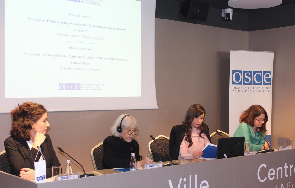 (L-r) Maryse Daviet, Head of the OSCE Mission to Montenegro; Aneta Spaić, Member of Montenegrin Media Council for Self-Regulation and Paula Petričević, Ombudswoman of Daily Vijesti and Weekly Monitor, presenting OSCE-supported "Guidelines for Applying Section 2.8 of Montenegrin Journalists' Code of Ethics" in Podgorica, Montenegro, 4 March 2019.