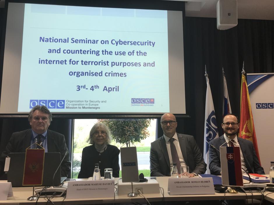 (l-r) John Corrigan, Programme Manager for Security Cooperation and Governance at the OSCE Mission to Montenegro, Maryse Daviet, Head of the OSCE Mission to Montenegro, Roman Hlobeň, Ambassador of Slovak Republic to Montenegro and Martin Balco, First Councillor at the Slovak Embassy to Montenegro opening the two-day seminar on cyber security and use of the Internet for terrorist and organized crime purposes in Podgorica, 3 April 2019.