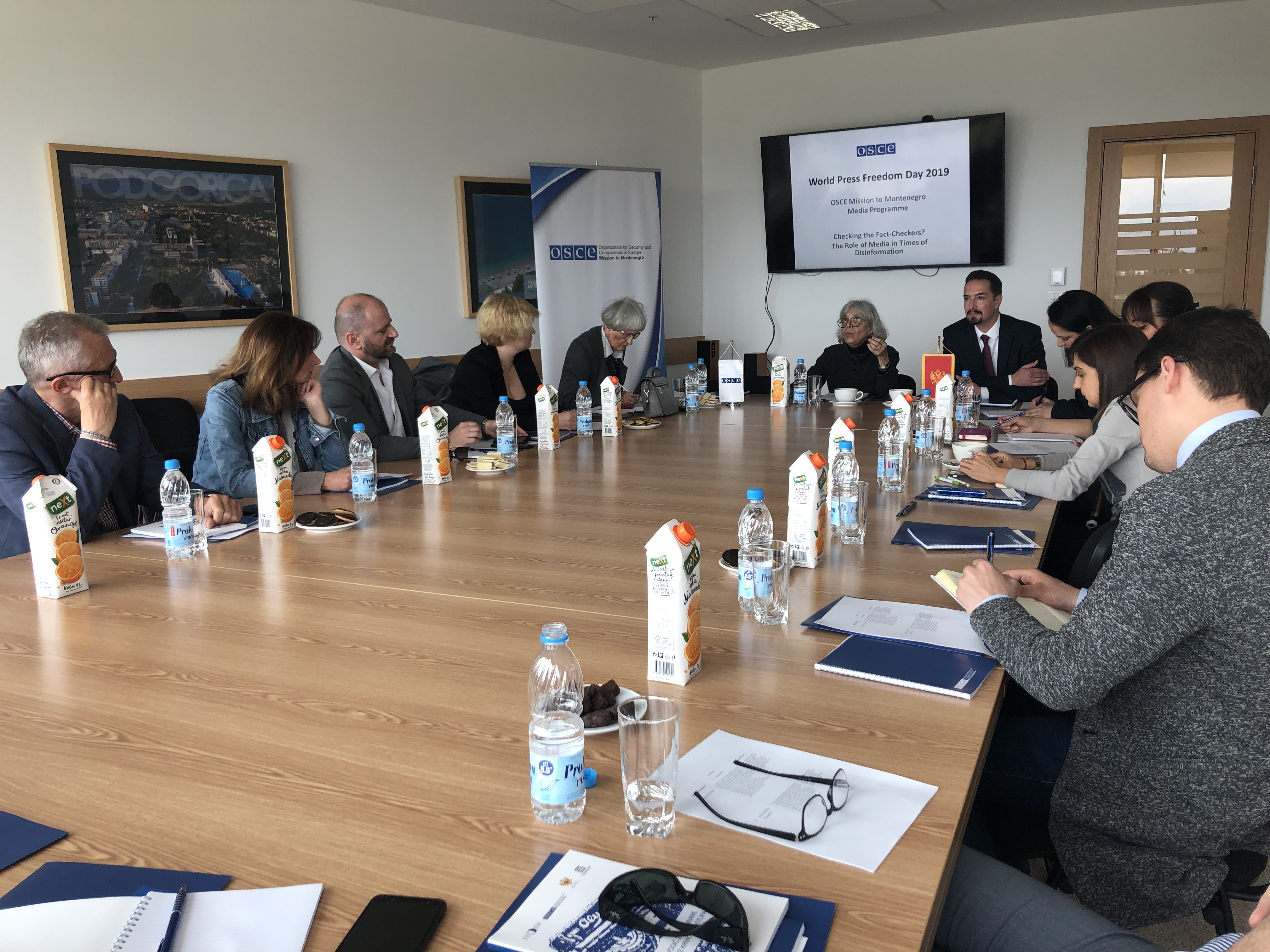 Maryse Daviet, Head of OSCE Mission to Montenegro and Daniel Blank, Media Programme Manager at the Mission discussing with Mission's media partenrs the special role that quality journalism and fact checking can play when facing disinformation, on the occasion of the World Press Freedom Day in Podgorica, Montenegro, 3 May 2019.