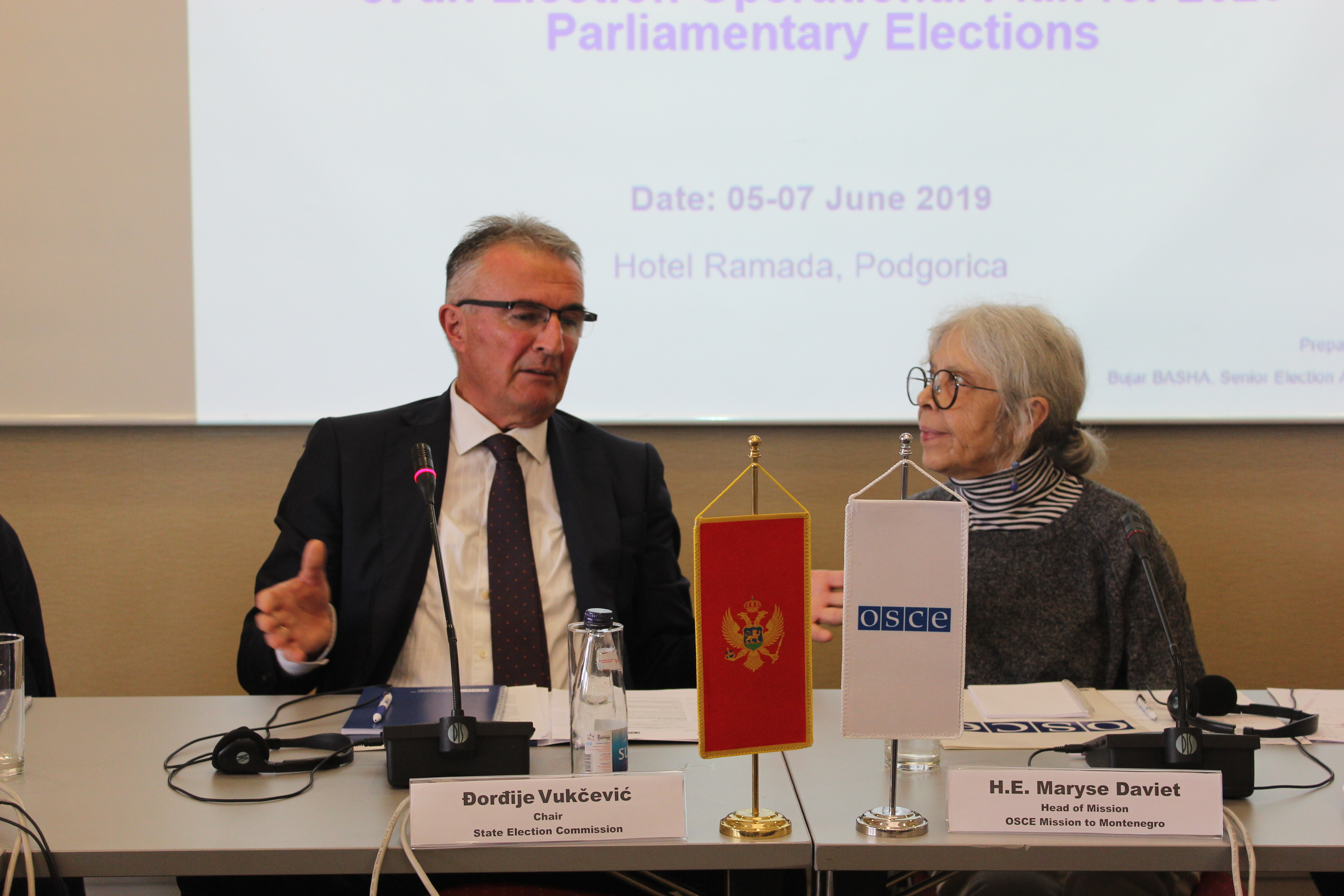Maryse Daviet, Head of the OSCE Mission to Montenegro and Đorđije Vukčević, Chair of the State Election Commission (SEC) opening the three-day seminar for members of the SEC on developing an election operational plan in Podgorica, Montenegro, from 5 to 7 June 2019.