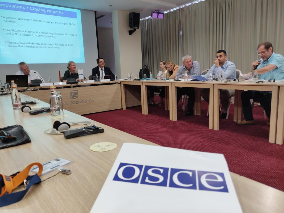 (l-r) Veljo Čađenović, State Election commission (SEC) Secretary, Siv-Katrine Leirtroe, Deputy Head of the OSCE Mission to Montenegro and Bujar Basha, OSCE Senior Election Adviser close the three-day workshop for SEC in developing a strategic work plan to identify key activities for 2019 and 2020, Podgorica, 14 June 2019.