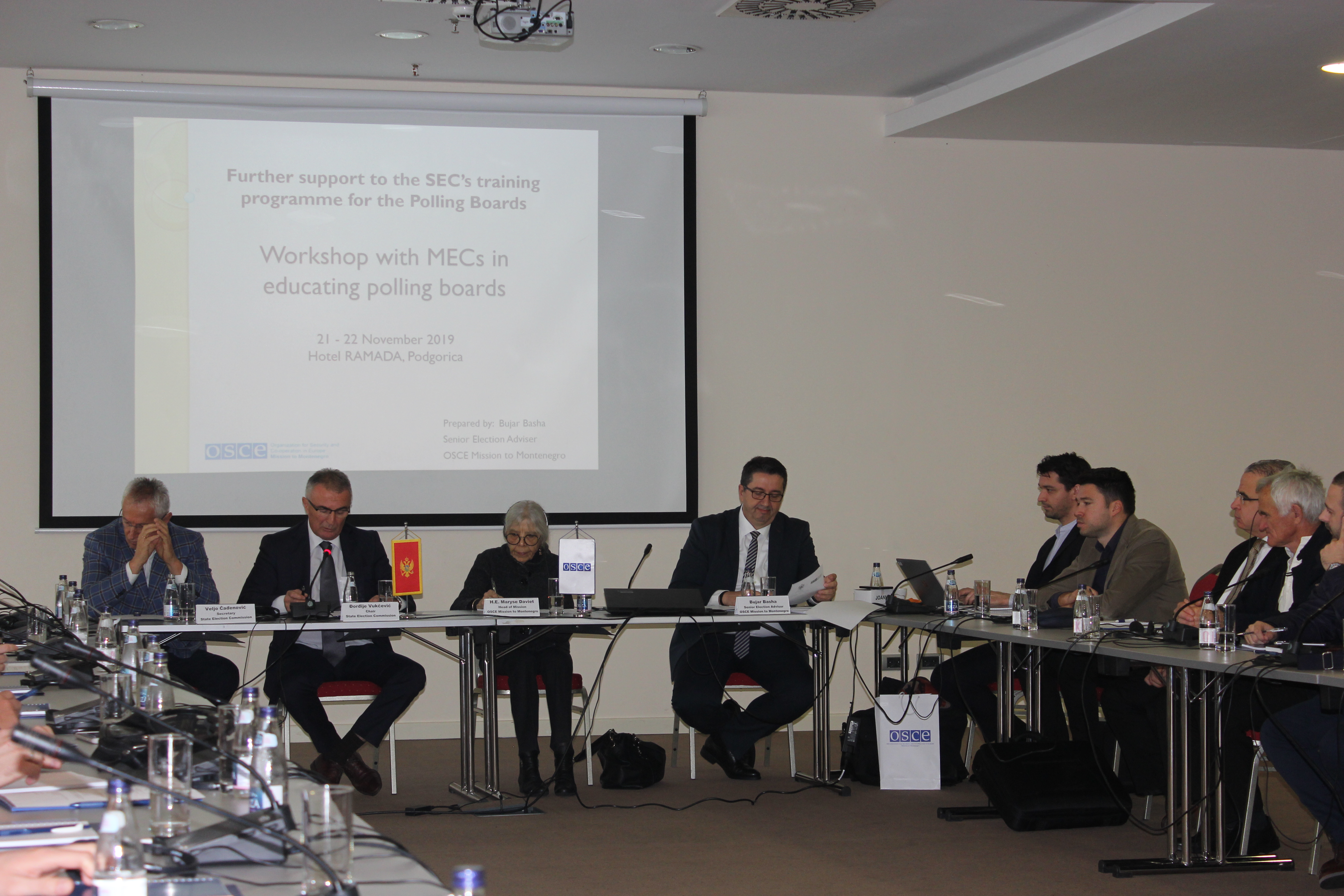 Maryse Daviet, Head of OSCE Mission to Montenegro, together with Đorđije Vukčević, Chairman of Montenegrin State Election Commission (l) and Bujar Basha, OSCE Senior Election Adviser (r), opens the training course for senior representatives from the State Election Commission and Municipal Election Commissions on how to train polling station staff on polling station procedures, Podgorica, 21 November 2019.
