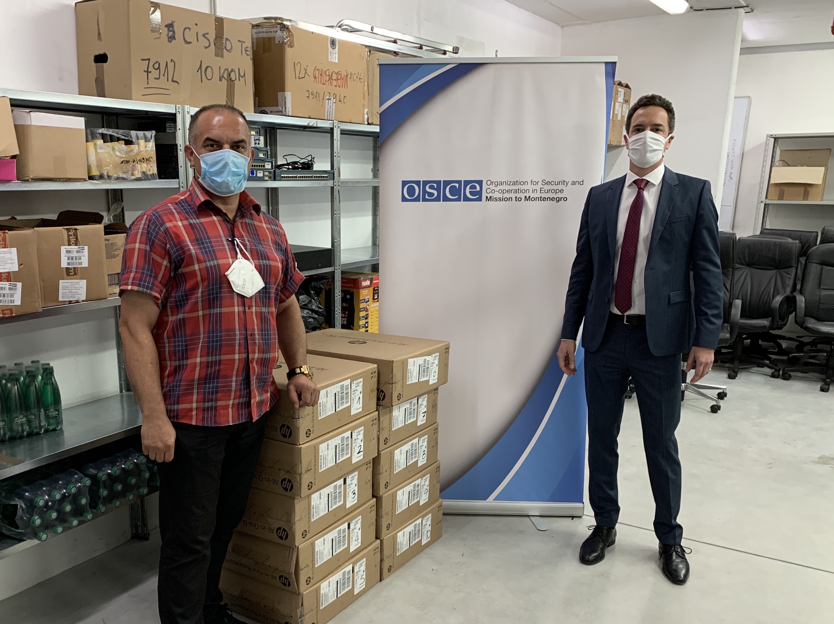 (r) Daniel Blank, Media Programme Manager in the OSCE Mission to Montenegro hands over the technical equipment - ten new desktop computers - to the news house Vijesti representative Luka Đukić, in order to support the ongoing modernization drive of media houses in Montenegro, Podgorica, 6 May 2020.
