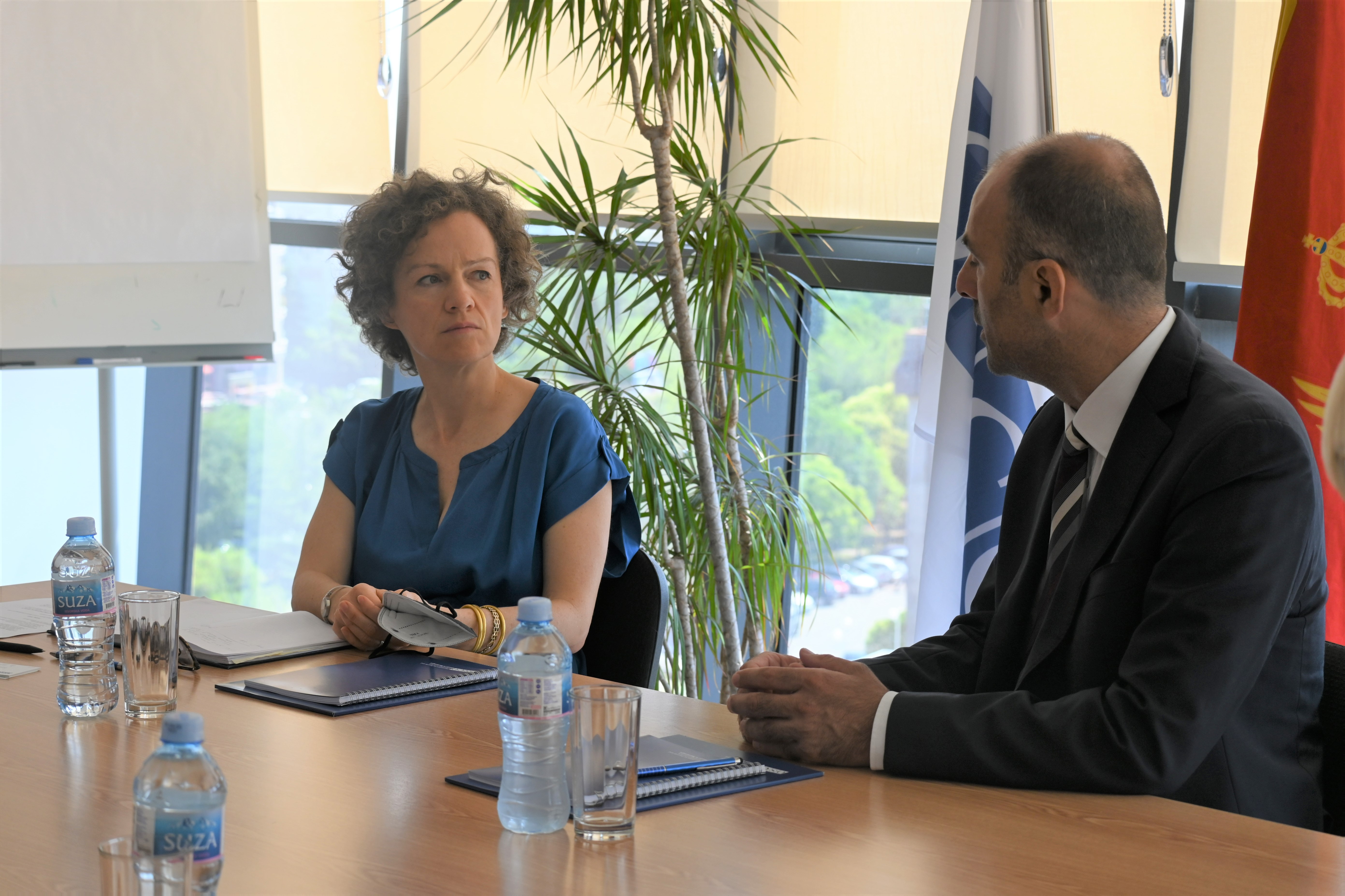 Dominique Waag, Head of the OSCE Mission to Montenegro, and Boris Raonić, General Director of the national public service broadcaster – Radio Television Montenegro (RTCG) during the meeting in which the findings from a survey "Exploring RTCG brand strength", commissioned by the Mission and conducted by the Damar agency, were presented in Podgorica, 5 July 2022.