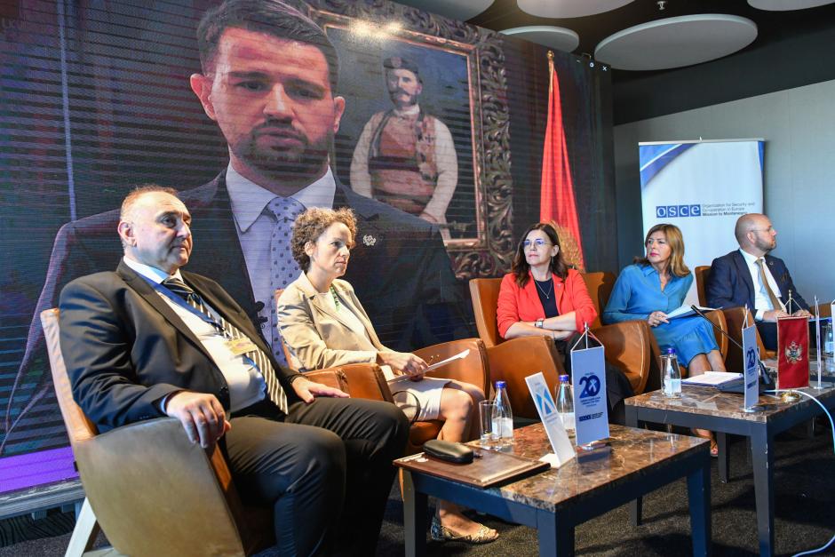 (c) Head of OSCE Mission to Montenegro Dominique Waag with (l) Protector of Human Rights and Freedoms of Montenegro Rights Siniša Bjeković and President of Montenegro Jakov Milatović delivering a video message at the regional conference “Ombudsperson Institution in times of crisis”, organized with the Mission's support in Podgorica, 28 September 2023.