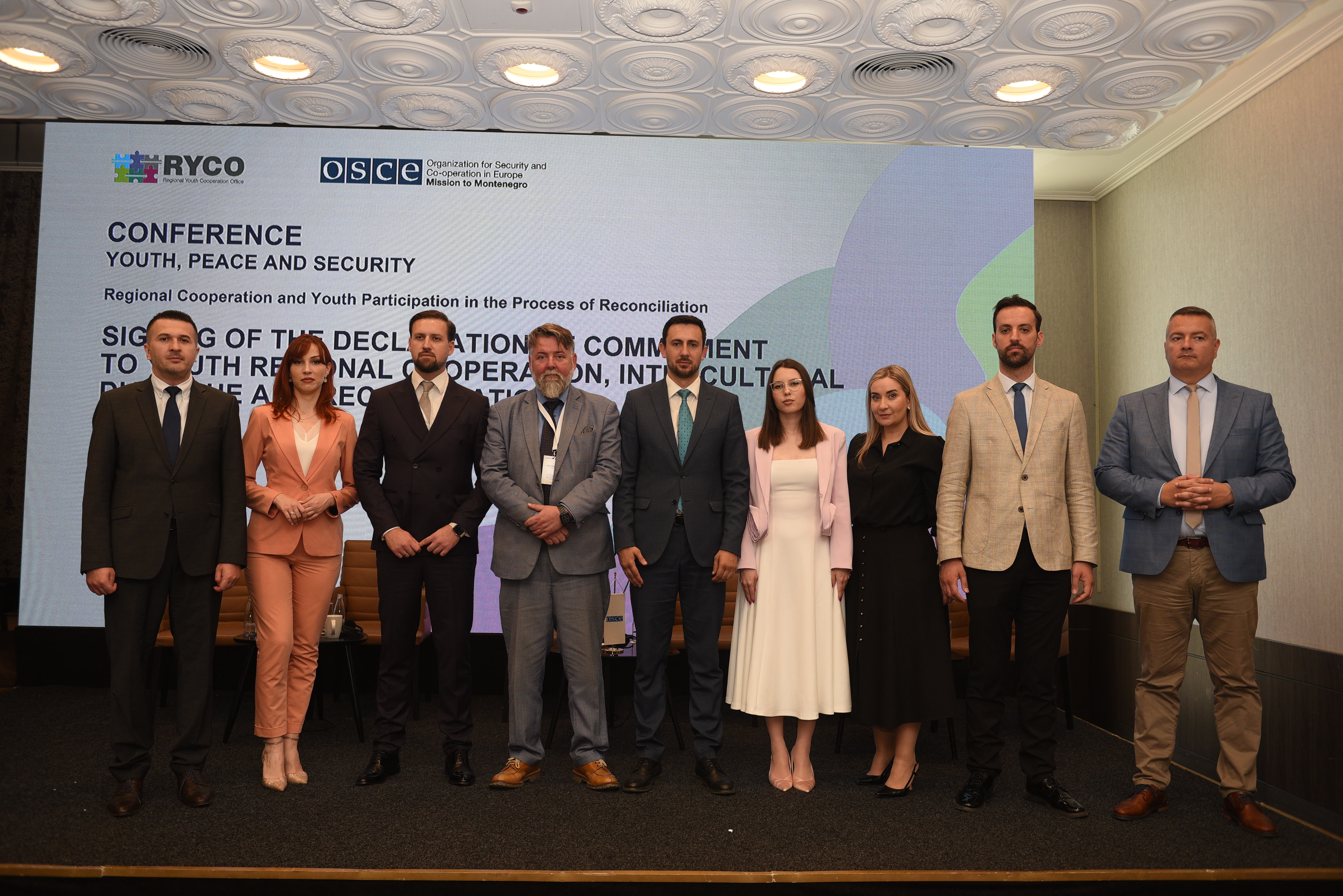Head of OSCE Mission to Montenegro, Jan Haukaas, and Head of RYCO Local Branch Office in Montenegro, Edin Koljenović, with part of Montenegrin MPs after signing the Declaration of Commitment to Youth Regional Cooperation, Intercultural Dialogue and Reconciliation, supported by the Mission, Podgorica, 12 June 2025.