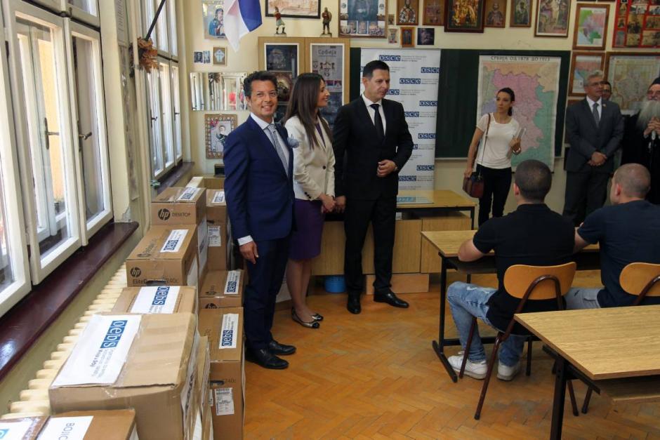 L-r: The Head of the OSCE Mission to Serbia, Andrea Orizio, Justice Minister Nela Kuburović and Governor of the Correctional Facility for Juveniles in Kruševac, Ivan Mijailović during a hand over of the OSCE Mission's donation of IT equipment and school supplies to the Kruševac Correctional Institution for Juveniles and to the Požarevac Prison for Women, Kruševac, 9 June 2017.