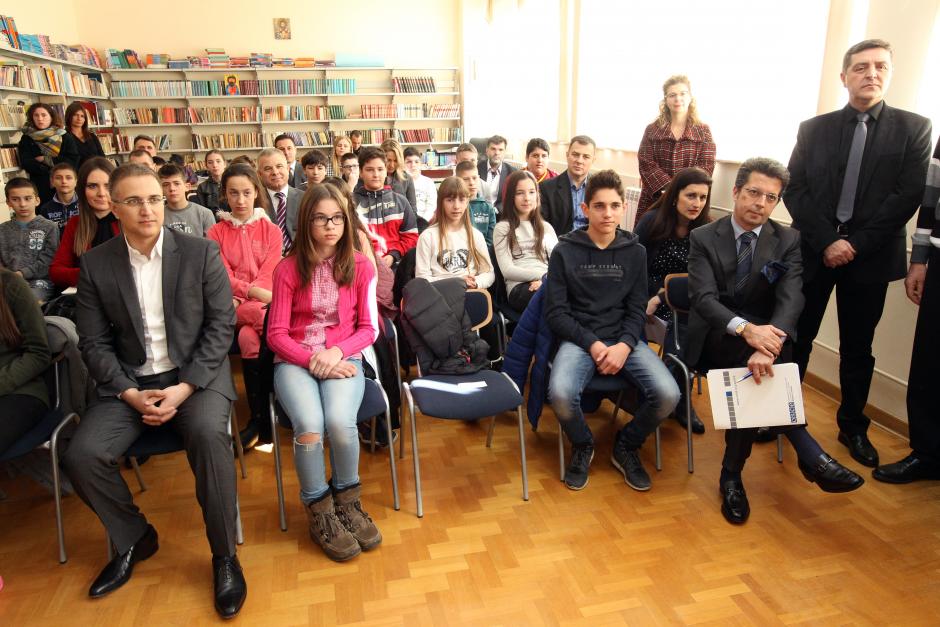 Ambassador Orizio (r), Minister Stefanović (l) and students of the Pavle Popović Primary School during a safety presentation on drug and alcohol abuse, Belgrade, 12 February 2018.