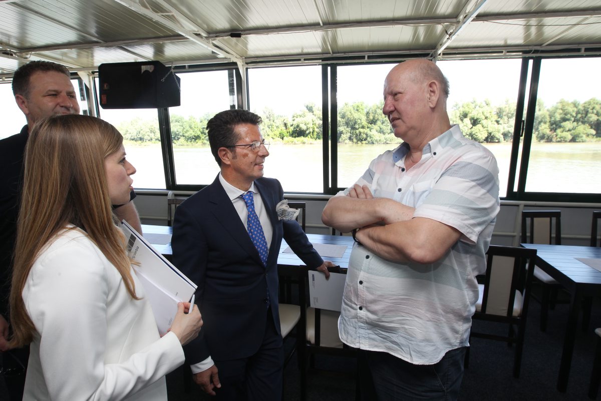 The Head of the Co-ordination Body for Preševo, Bujanovac and Medveđa, Zoran Stanković (c-r) welcomes the Head of the OSCE Mission to Serbia, Ambassador Andrea Orizio (c-l) at a Belgrade sightseeing cruise on rivers Sava and Danube for primary school students from Preševo, Bujanovac and Medveđa, Belgrade, 26 June 2019.