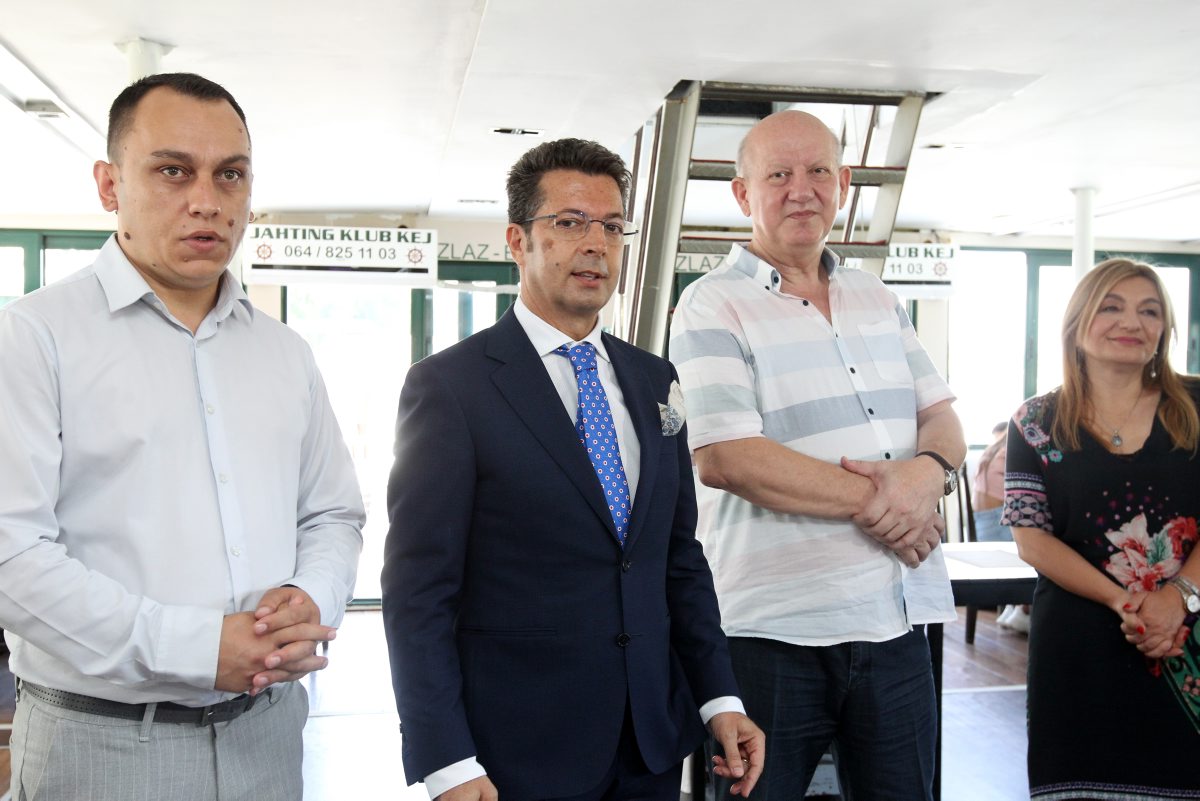 (l-r): The chief of cabinet of the Mayor of Bujanovac, Rahim Salihi, Ambassador Andrea Orizio, the Head of the OSCE Mission to Serbia the Head of Co-ordination Body for Preševo, Bujanovac and Medveđa, Zoran Stanković and the Assistant Minister of Education, Vesna Nedeljković, address the mixed group of ethnic Albanian, Roma and Serbian students taking a Belgrade sightseeing cruise on rivers Sava and Danube, Belgrade, 26 June 2019.
