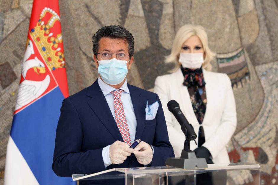 Andrea Orizio (l), Head of the OSCE Mission to Serbia, speaks at the multi-sectoral meeting organized by Government of Serbia's Coordination Body for Gender Equality Head, Deputy Prime Minister, Zorana Mihajlovic (r), devoted to exchange and response to impact COVID-19 has on violence against women and girls, Belgrade, 29 April 2020.