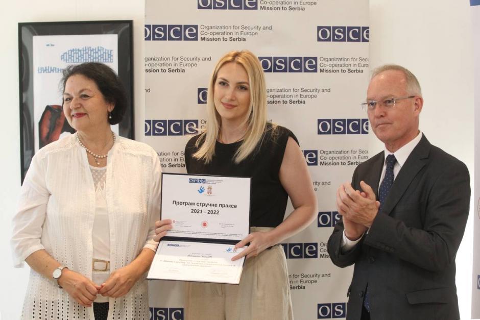Head of the OSCE Mission to Serbia (r) and Minister of Human and Minority Rights and Social Dialogue (l) with one of the ten participants of the Professional Practice Programme, part of the OSCE Mission's project that enabled 10 young professionals from southwest and south Serbia to work with state institutions for a six-month period, Novi Pazar, 16 June 2022.