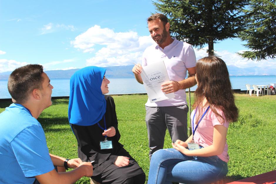 OSCE representative discusses the proposals for activities with the participants of the Confidence Building Youth Workshop in Ohrid, 2-5 September 2017.