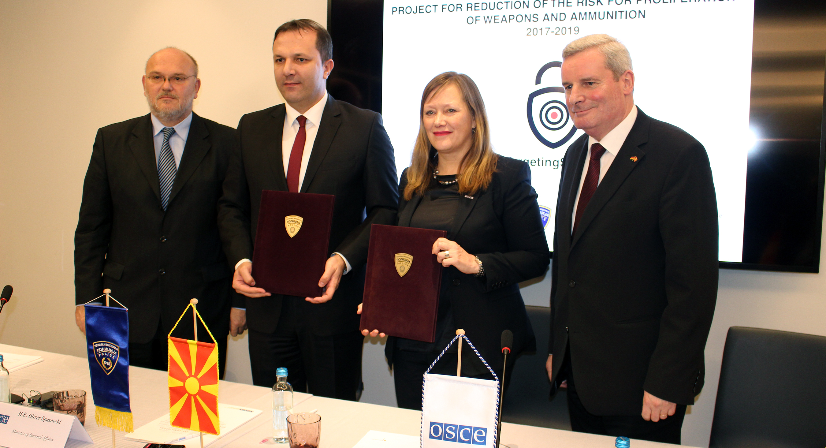 Nina Suomalainen, Head of Mission (c) and Oliver Spasovski, Minister of Internal Affairs signing the Memorandum of Understanding to implement a project aimed at reducing the risk of proliferation of weapons and ammunition. Skopje, 30 November 2017.