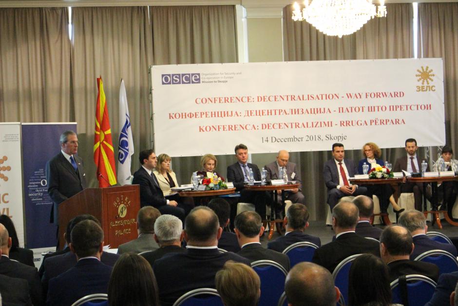 Head of the OSCE Mission to Skopje, Ambassador Clemens Koja, addressing the OSCE national conference on decentralization that gathered government ministers and mayors to discuss remaining challenges of the decentralization process. Skopje, 14 December 2018.