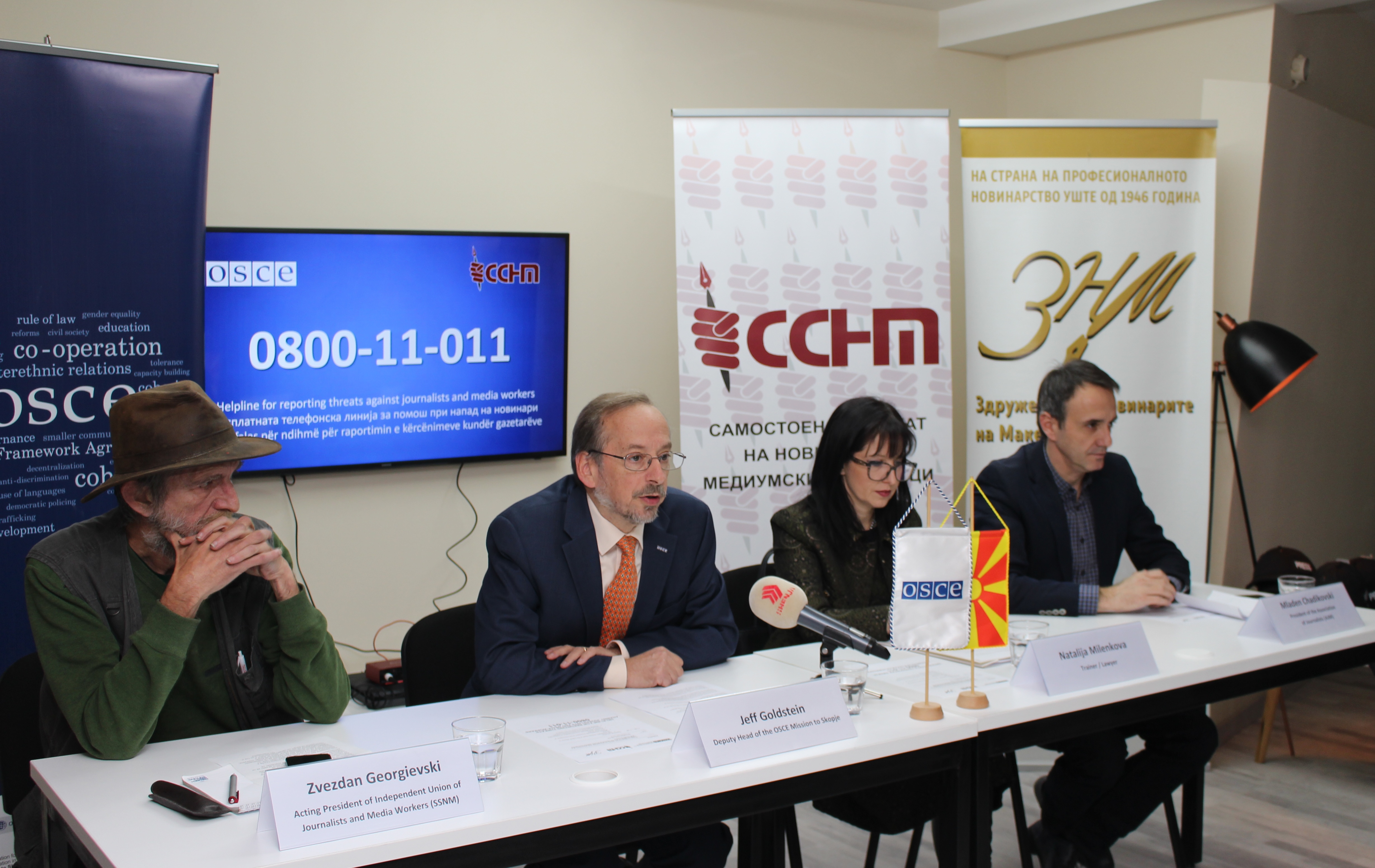 Deputy Head of the OSCE Mission to Skopje, Jeff Goldstein, addressing at the press conference for promotion of the helpline for reporting threats against journalists and media workers. Skopje, 21 December 2018.