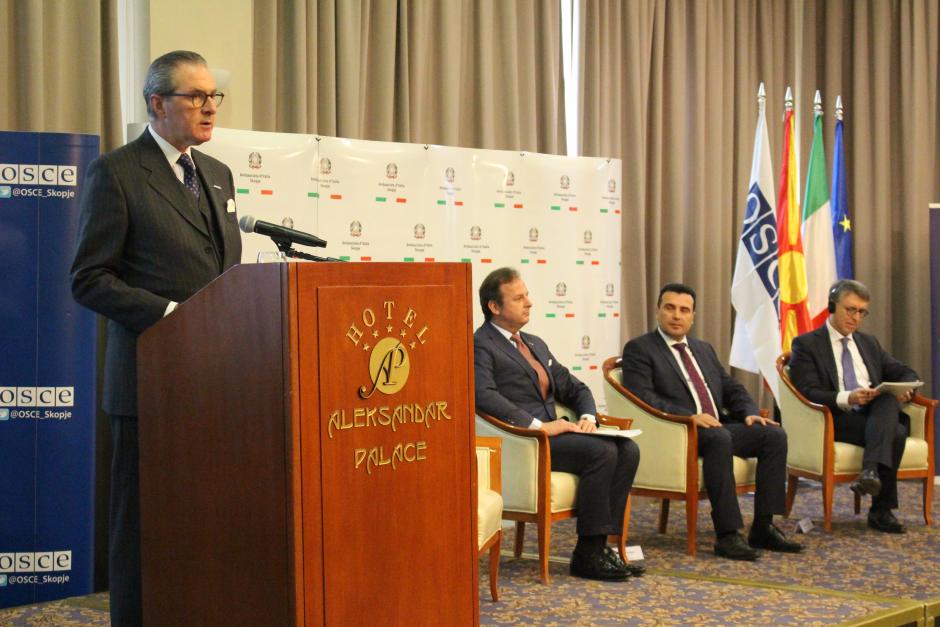 Head of the OSCE Mission to Skopje, Ambassador Clemens Koja addresses the conference on the role of law enforcement agencies in the struggle against corruption. Skopje, 22 February 2019.