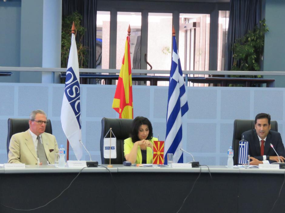 Head of OSCE Mission to Skopje, Ambassador Clemens Koja (left) with North Macedonia's National Coordinator for Combatting Trafficking in Human Beings and Illegal Migration Magdalena Nestorovska and her Greek counterpart Heracles Moscoff at the OSCE-supported meeting between representatives of two countries aimed at strengthening the mutual synergies in countering human trafficking. Ohrid, 1 July 2019.