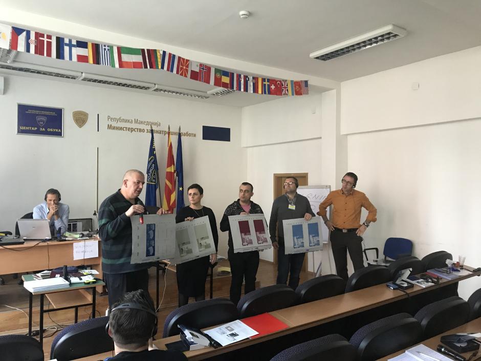 Participants explaining security printing techniques to their colleagues during a practical section of the training, Skopje, 5 November 2019.
