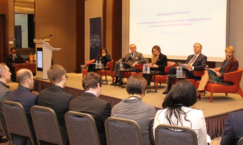 Participants of the regional conference supported by the Albanian OSCE Chairmanship discuss the ways to build resilience to corruption in South-Eastern Europe, Skopje, 10 February 2019.