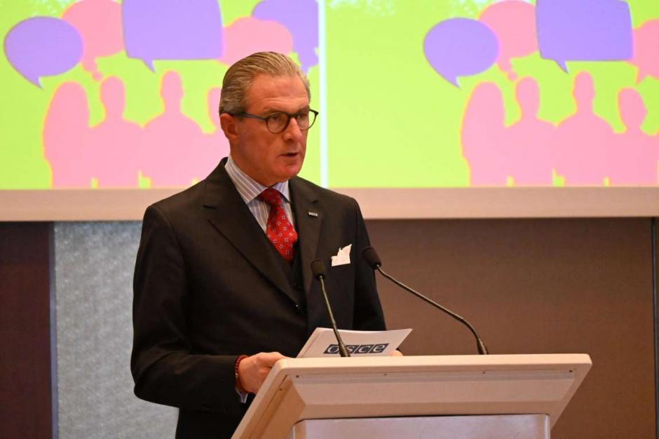 Head of OSCE Mission to Skopje, Ambassador Clemens Koja addressing an event promoting the Guidelines for Joint Classes, prepared with the Mission's support. Skopje, 17 December 2021 (OSCE/Zoran Richliev)