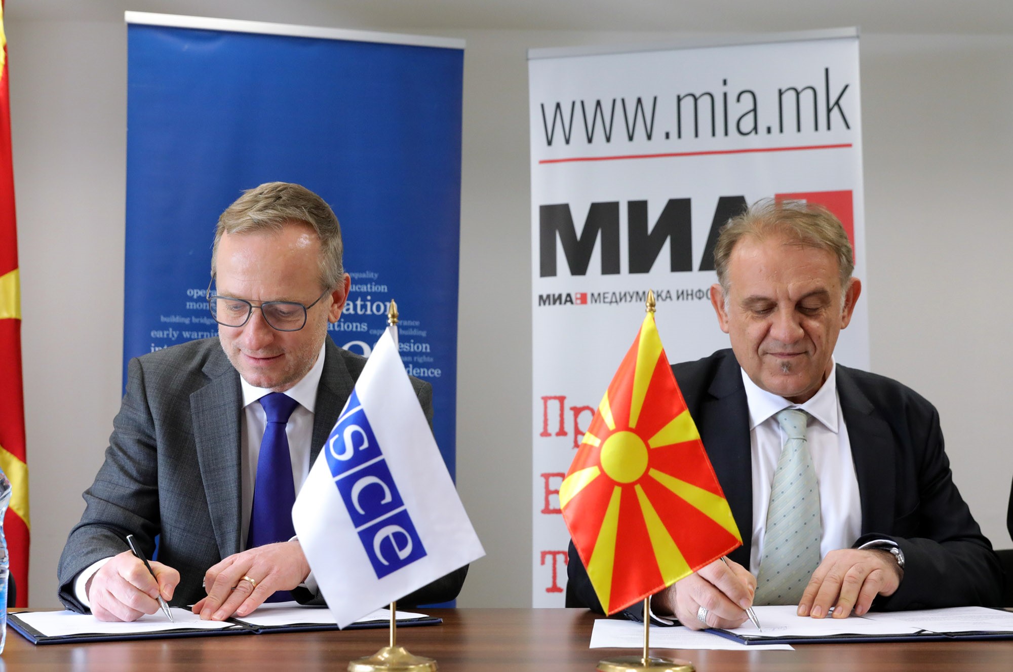 Head of the OSCE Mission to Skopje, Kilian Wahl, signs Memorandum of Understanding agreement with Dragan Antonovski, Director of Media Information Agency. Skopje, 3 March 2023.