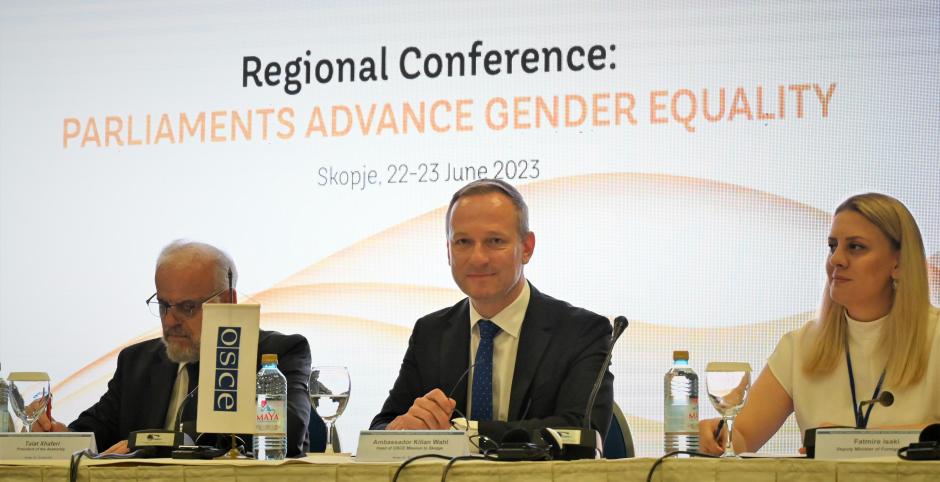 Head of OSCE Mission to Skopje, Ambassador Kilian Wahl, addresses the regional conference "Parliaments advance gender equality" together with Parliament Speaker Talat Xhaferi and Deputy Foreign Minister Fatmire Isaki. Skopje, 23 June 2023