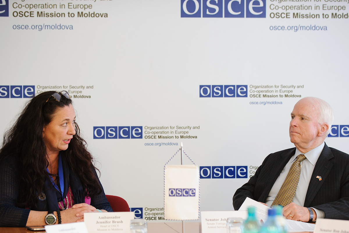 Ambassador Jennifer Brush (l), the head of the OSCE Mission to Moldova, in discussion with US Senator John McCain, Chisinau, 17 April 2014.