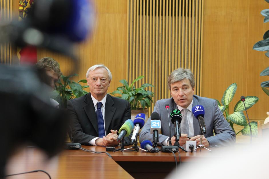 The Special Representative of the OSCE Chairperson-in-Office for the Transdniestrian Settlement Process Ambassador Radojko Bogojević (l) and the chief negotiators in the Transdniestrian settlement process Eugen Carpov (r) in Chisinau prepare for the second round of the talks in the 5+2 format that will take place in Vienna on 5-6 June 2014.