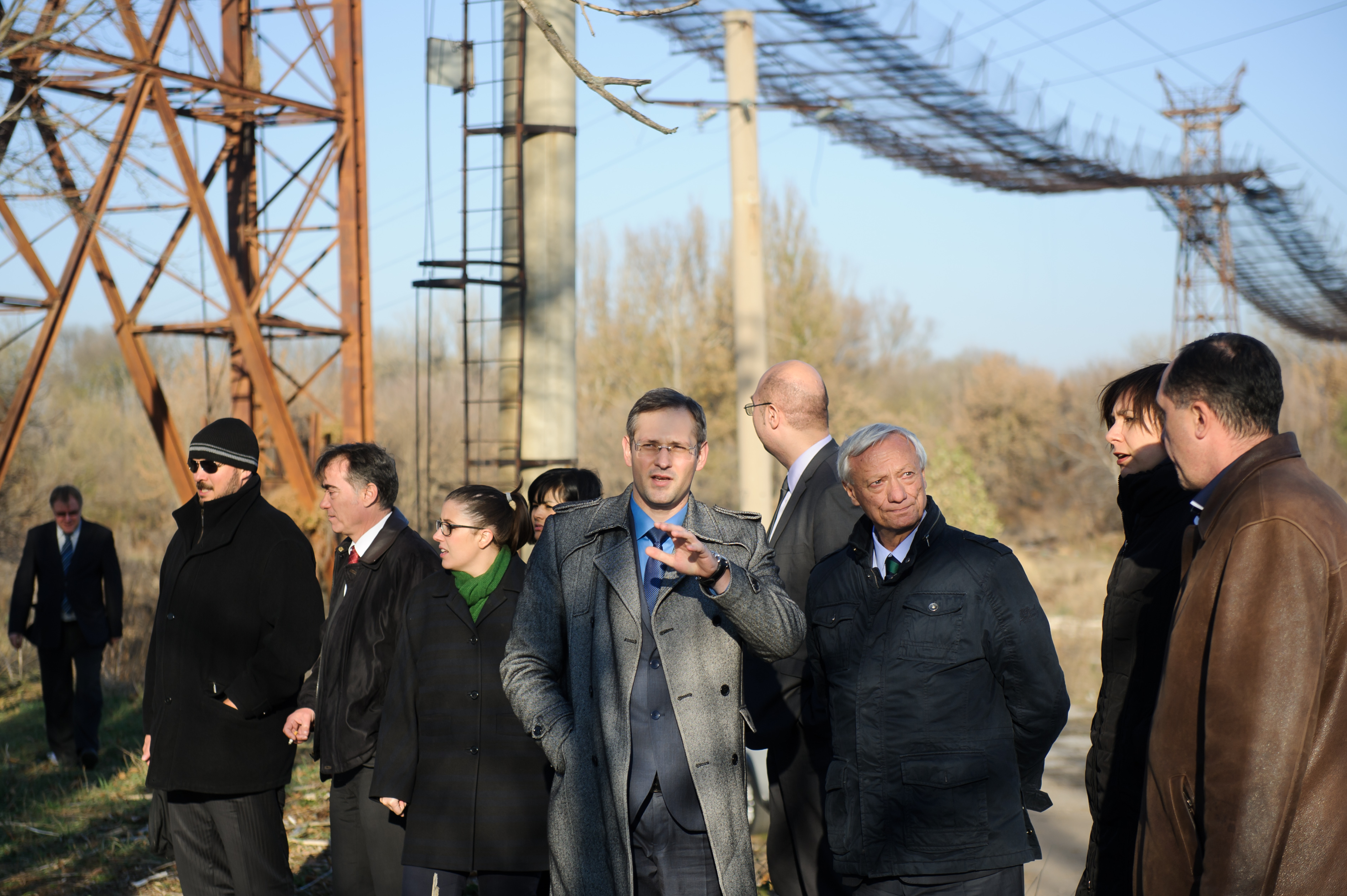 The Special Representative of the OSCE Chairperson-in-Office for the Transdniestrian Settlement Process Ambassador Radojko Bogojević (center right) during a visit to the site of the industrial cable car network spanning the Dniester/Nistru River, Rybnitsa, 28 October 2014.